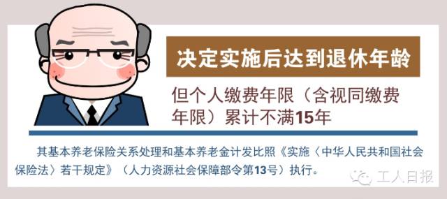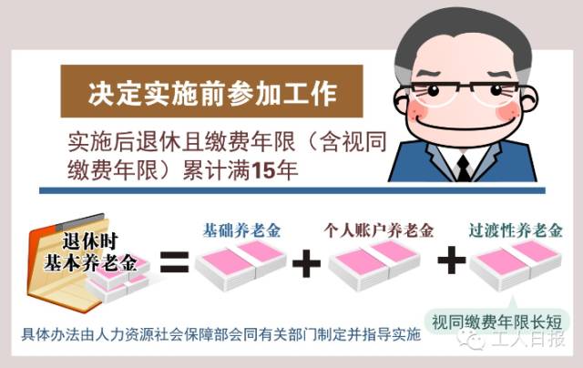决定实施前参加工作、实施后退休且缴费年限(含视同缴费年限,下同)累计满15年的人员,在发给基础养老金和个人账户养老金的基础上,再依据视同缴费年限长短发给过渡性养老金。