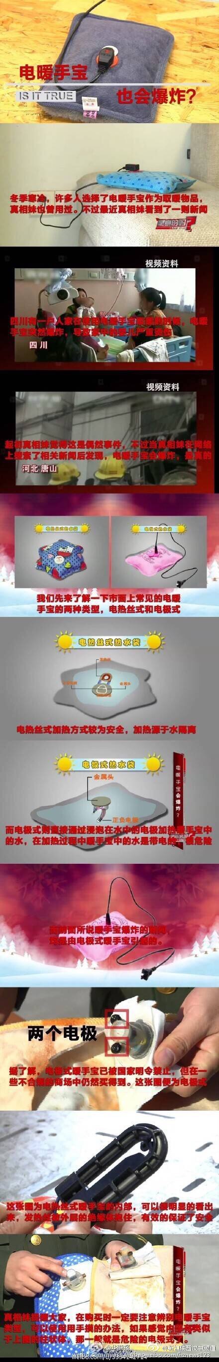 【小伙伴注意了!电极式暖手宝其实是定时炸弹!】电极式热水袋易发生爆炸。在购买的时候,可以用手轻轻地捏一下来分辨。如果里面有一个非常明显的弧形线圈装置,那就是电热丝式热水袋,如果捏到的是两截硬邦邦的圆柱体,那肯定就是电极式热水袋了,就不要购买了。戳大图看真相吧!
