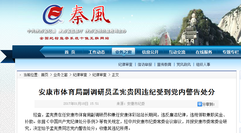 1月18日,陕西省纪委网站(秦风网)发布消息,安康市体育局副调研员兼安康体彩站站长孟宪贵因违纪被给予党内警告处分。