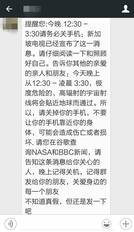 “提醒您今晚12:30—3:30务必关机,新加坡电视台已经宣布了这条消息,今晚极度危险的高辐射宇宙射线将会贴近地球而通过。不要让你的手机靠近你的身体,可能会造成伤亡或者损坏。NASA、BBC新闻里都说了,请转告亲友今晚记得关机。”华商记者发现,这样一条消息这两天在微信、微博被频繁转发。来自微信好友的提醒还是让很多人慌了神,很多人自觉地在晚上关了手机。“昨晚已经关机了,又有人说今晚,到底是哪一天,靠谱不啊。”像小张一样的网友质疑。