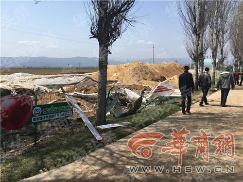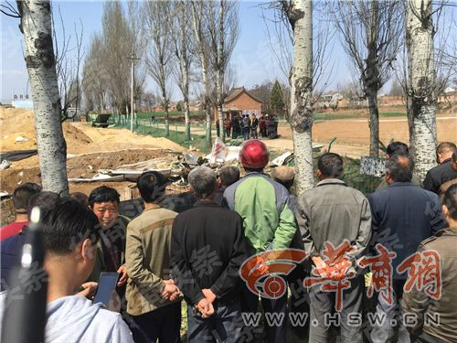 飞机坠毁地点距离最近的村民房屋不到百米,坠毁现场的田地,是培育苹果苗的基地,路边堆积着几大堆4、5米高的锯末,飞机刚好坠毁在旁边,已经摔的支离破碎,机体的残骸有部分飞出十几米远。