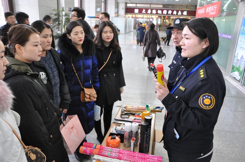 当日上午,宝鸡南站派出所干警来到旅客当中,为旅客宣传讲解了乘坐高铁安全常识、安检查危法规及常见危险品展示等内容,系统全面的介绍了今年春运广大旅客乘坐高铁的相关注意事项,同时,结合“西铁安检”微信公众号,为广大旅客提供便捷的安检危险品信息查询功能,全力确保广大旅客春运出行的安全、方便、快捷