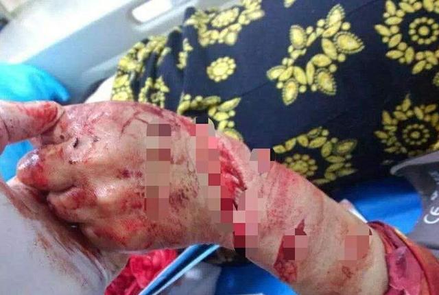 4月5号晚上11点左右,52岁的郭某独自一人乘坐出租车回家,在家门口附近下车后,遭遇歹徒抢夺财物,在拼命反抗中,手腕被连砍好几刀,只剩下皮肉相连。