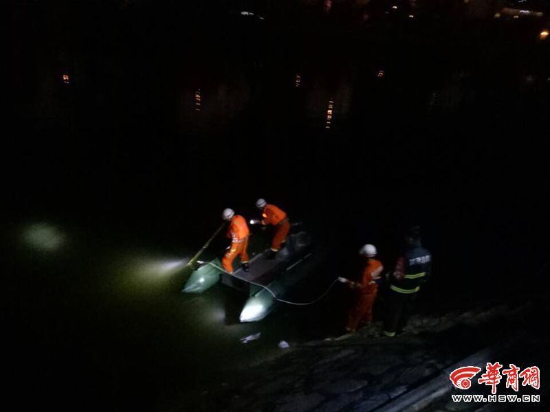 4月16日晚8时40分,华商报记者赶到事发现场商洛市区丹江彩虹桥西300米处,河边聚集了大量群众,现场拉起了警戒线 ,几名消防官兵穿着救生衣,打着手电筒,在河里划着橡皮艇,用竹竿摸索着打捞落水者。
