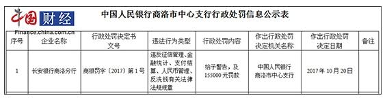 10月31日早9时,华商报记者从中国人民银行商洛市中心支行得到确认,长安银行商洛分行因违反征信管理、金融统计、支付结算、人民币管理、反洗钱等有关法律法规规章,中国人民银行商洛市中心支行于10月20日下发“商银罚字(2017)第1号文件”,决定对长安银行商洛分行给予警告处分,并处以155000元罚款。中国人民银行商洛市中心支行办公室工作人员称,对于长安银行商洛分行具体违规细节,根据相关规定不便对外公开。华商记者 程娟