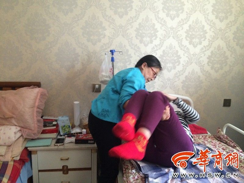 在医院接受治的多半年时间里,李艳华坚持每天给张娟翻身、按摩、擦拭身体。“当时她没有任何意识和反应,我就一直待在医院里,后来孩子想妈妈了,也经常到医院里来。儿子工作比较忙,忙起来的时候,自己连饭都顾不上吃,孩子也照顾不上,我就把他也带在我身边一起照顾。”李艳华说,植物人患者经常会在夜里发烧,她就冻了很多小冰块放在冰箱,一遇到发烧的情况,就给张娟腿弯、腋下、身体两侧放置冰块,“医生说给她不能打针吃药,给她只能物理降温。在住院的日子,几乎没有睡过囫囵觉。”
