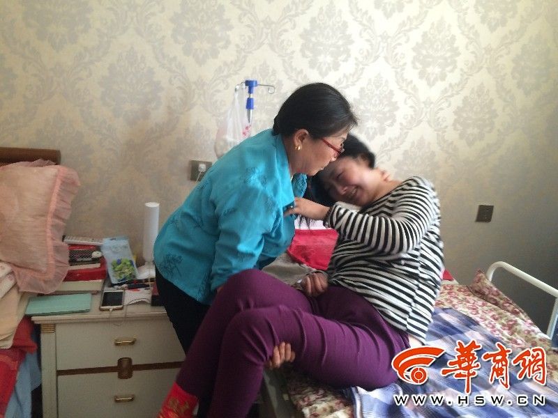 3月27日上午,在李艳华的家里,躺在里屋床上的张娟,一见到有陌生人来,马上笑着对着李艳华喊了起来:“妈妈,妈妈!”李艳华马上就明白了她的意思,笑着说:“那你和客人握个手吧。”
