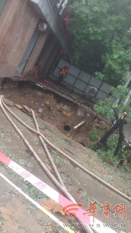 6月5日上午,华商报记者赶到现场,距事发现场3米外,已被拉起警戒线与围挡。经观察,塌陷地面直径约4到5米,深度约7米,连同一颗行道树被塌陷其中,坑底有大量积水。数名工作人员正在进行抢修预备工作。另外,该塌陷事件,导致一旁门面房部分地基及周边地表悬空,现场情况比较危急。