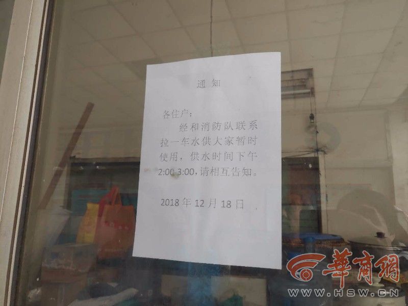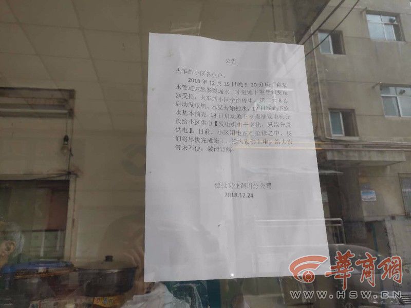 12月25日中午,记者来到魏女士所住的建行家属院。一张落款为建投实业铜川分公司日期为12月24日的告示张贴在保卫室的玻璃上:2018年12月15日晚9点30分,由于自来水管道突然暴裂漏水,冲进地下室导致变压器受损,火车站小区全面停电,第2天8点启动发动机、水泵开始抽水,17日晚地下室水基本抽完,18日启动地下室柴油发动机分段给小区供电(发电机由于老化,只能分段供电)目前,小区用电正在抢修之中,我们将尽快完成施工,给大家供上电。