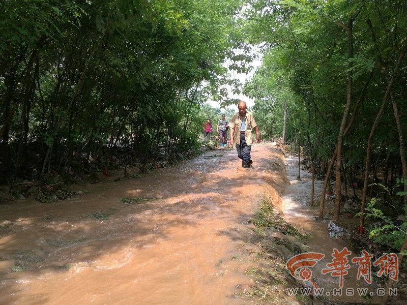 6月7日凌晨,渭南市突降一场暴雨,临渭区桥南镇天刘村几户人家被淹,山洪裹挟垃圾和石块将河道堵塞,河水改道使数亩果园被冲,道路中断。华商记者 陈冰