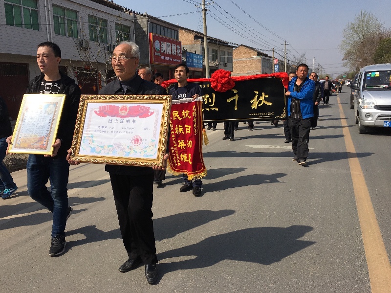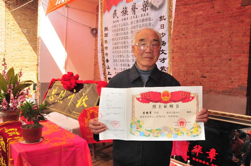 4月2日上午10时许,礼泉县城关镇钞里村七旬老人苟英俊家前锣鼓喧天,鞭炮齐鸣,“为抗日烈士苟锦章同志正名庆典仪式”在此举行。院内,一张被裱好摆在桌子上的烈士证明书显得格外醒目,这张由中华人民共和国民政部颁发的证明书上写着,“苟锦章同志在抗日战争中牺牲,被评为烈士”。烈士苟锦章正是77岁老人苟英俊的父亲。