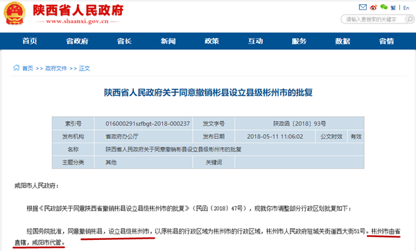 5月11日上午,陕西省政府网站公布《陕西省人民政府关于同意撤销彬县设立县级彬州市的批复》,经国务院批准,同意撤销彬县,设立县级彬州市,以原彬县的行政区域为彬州市的行政区域,彬州市人民政府驻城关街道西大街51号。彬州市由省直辖,咸阳市代管。
