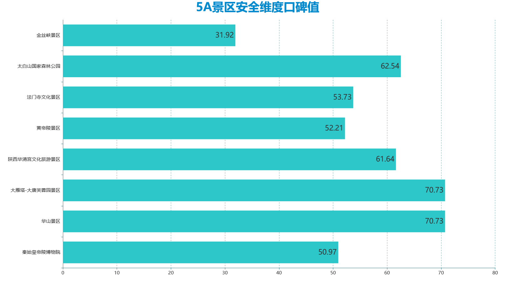 秦始皇陵博物院口碑综合评分90.42排在榜首,其次位于80-90份区间的有华山景区84.34,大雁塔-大唐芙蓉园82.41分,华清宫景区81.07分。黄帝陵、法门寺、太白山分别以72.03、71.71和70.77分排在5、6、7位。金丝峡口碑最差,67.07分排在口碑榜最后一位。