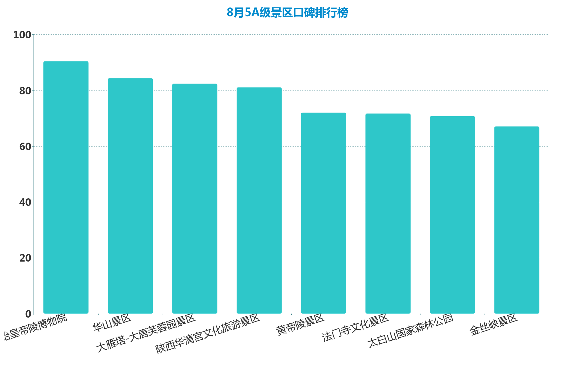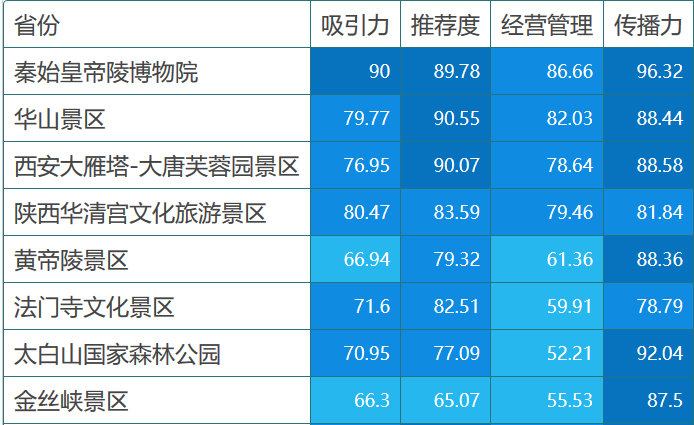 8月陕西省5A级景区吸引力均值75.37,推荐度82.25,经营管理能力仅有69.47,传播力相对较高87.86。