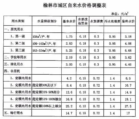 15日,华商报记者从榆林市物价局获悉,根据《榆林市城区居民阶梯水价和非居民用水超定额累进加价有关问题的通知》,榆林城区居民用水采用三级阶梯价格,一级户均用水量为108立方米/户·年,水价由原来的2.45元/立方米上调到3.18元/立方米,上调0.73元/立方米,其他用水均由不同程度的上调,上调水价从1月15日开始执行。