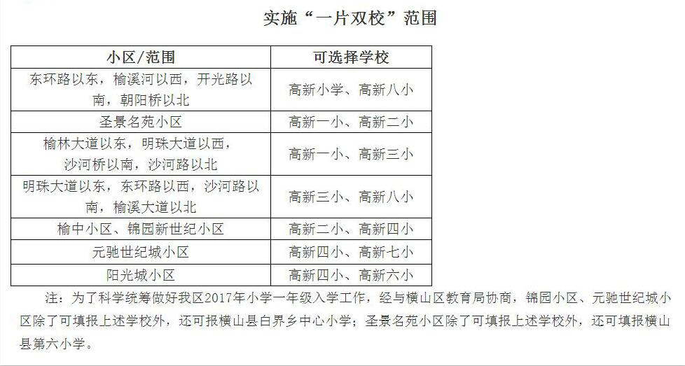 结合实际,今年榆林市高新区将继续在部分居民集中的片区、依据“就近入学”原则实行“一片双校”政策,即在东环路以东,榆溪河以西,沙河路以南,朝阳桥以北的适龄儿童既可选择填报高新小学,也可填报高新八小;圣景名苑小区居住的适龄儿童既可选择填报高新一小,也可填报高新二小;榆林大道以东,明珠大道以西,沙河桥以南,沙河路以北既可填报高新一小,也可填报高新三小;明珠大道以东,东环路以西,沙河路以南,榆溪大道以北既可填报高新三小,也可填报高新八小;榆中小区、锦园小区的适龄儿童既可选择填报高新二小,也可填报高新四小;阳光城小区适龄儿童既可选择填报高新四小,也可填报高新六小;元驰世纪城小区居住的适龄儿童,既可填报高新四小,也可填报高新七小。此外,经与横山区教育局协商,锦园小区、元驰世纪城小区除了可填报上述学校外,还可报横山县白界乡中心小学;圣景名苑小区除了可填报上述学校外,还可填报横山县第六小学。凡符合上述条件的适龄儿童不可同时填报两所学校(系统只能识别一所学校)。